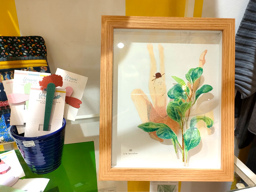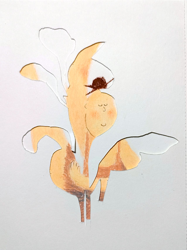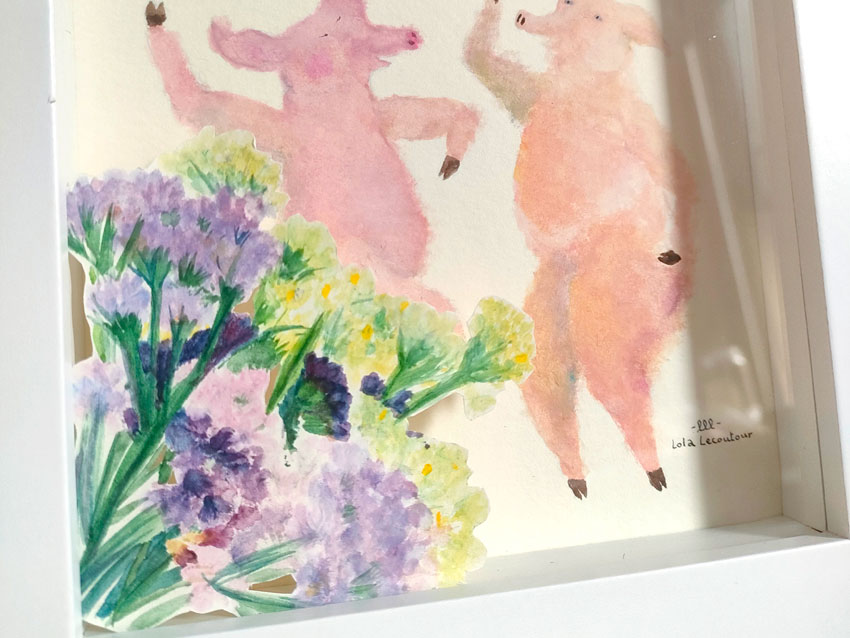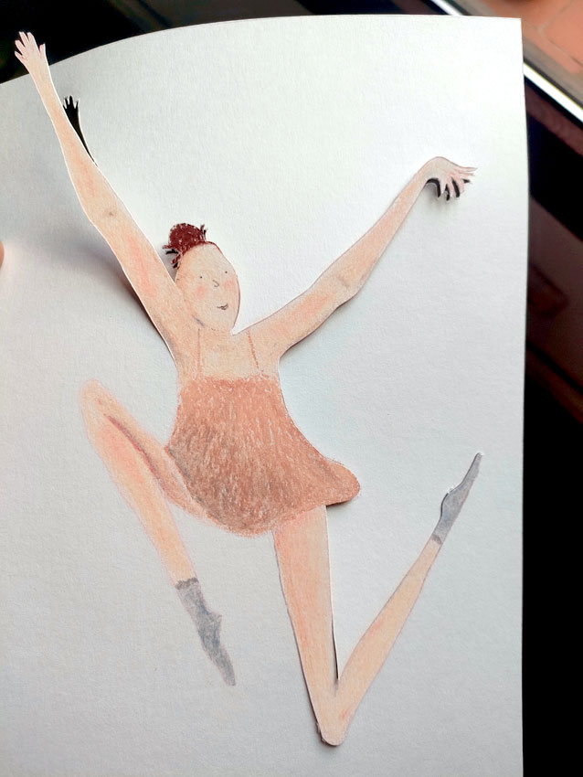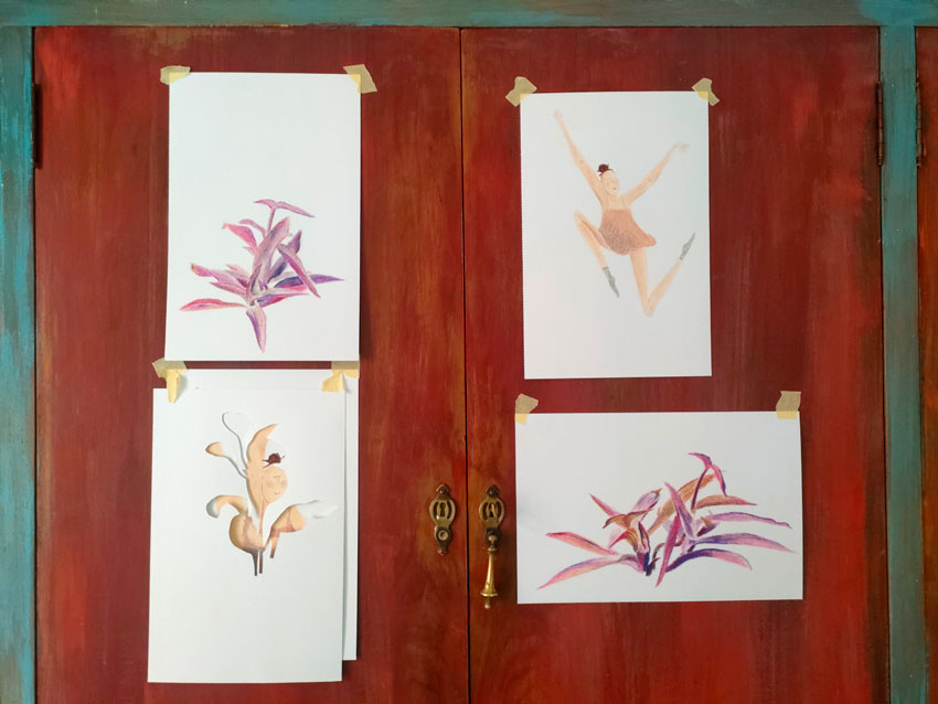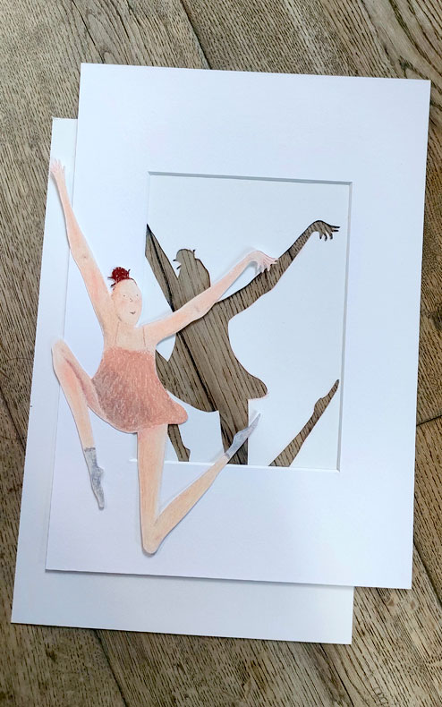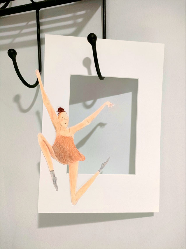 En dessinant successivement la ballerine et la plante, m’est venue l’idée de les unir. J’ai ainsi découpé la plante pour la superposer sur la danseuse. En utilisant un cadre profond c’est une autre dimension qui se créer. Le dessin sort littéralement de la feuille de papier comme pour prendre vie. Jeux d’ombres, de profondeur. Une manière de créer du mouvement tout en restant statique.