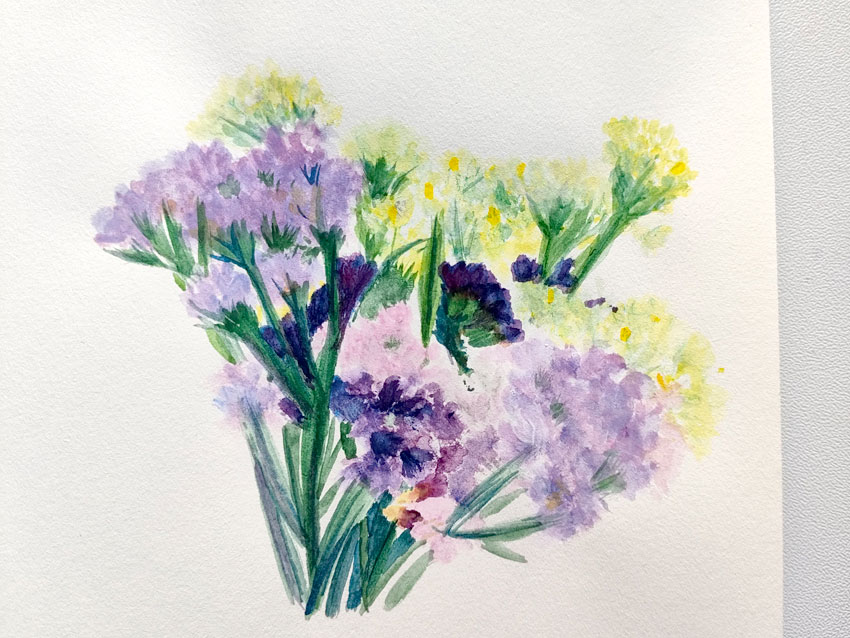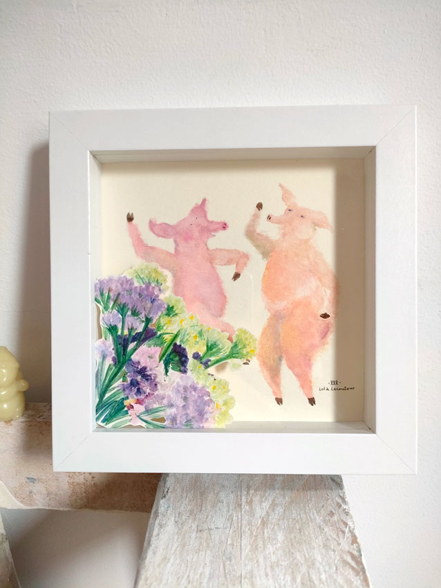 Cochons et bouquet de fleurs. Même processus (mais beaucoup de temps entre la réalisation des deux dessins).