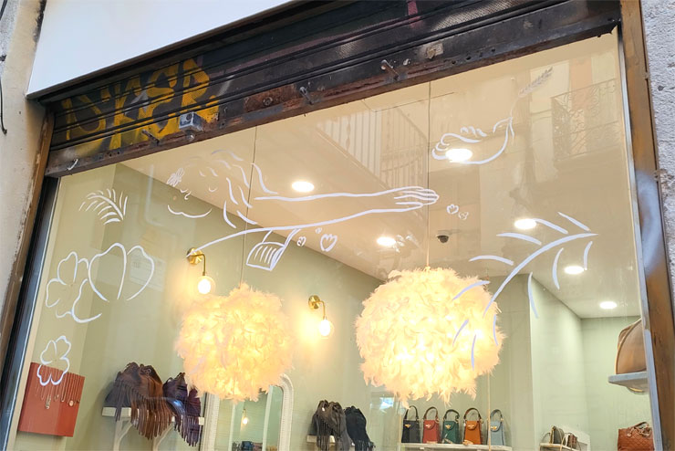 Vitrine monochrome peinte à l’acrylique. Boutique Claudine, accessoires pour femmes, style romantique, bohème. En plein cœur de la ville de Barcelone, quartier Gothique. Fait le jour de la San Jordi !
