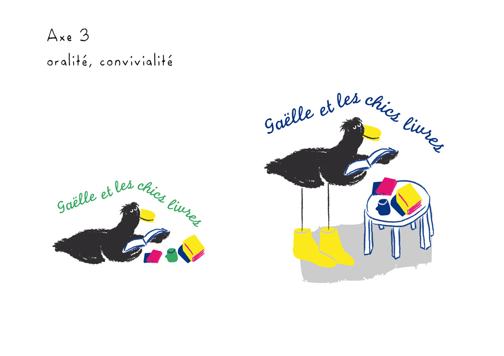 Gaëlle, animatrice du club de lecture Gaëlle et les chics livres, cercle des lecteurs des médiathèques Caux Seine Agglo, m’a contacté une première fois par mail pour une demande de logotype « illustration ». Gaëlle voulait créer une nouvelle image dynamique et joyeuse pour son club, à travers un personnage qui la représenterait. J’ai tout de suite été séduite par le projet et très enthousiaste.