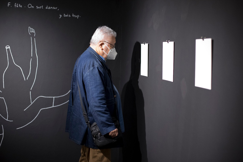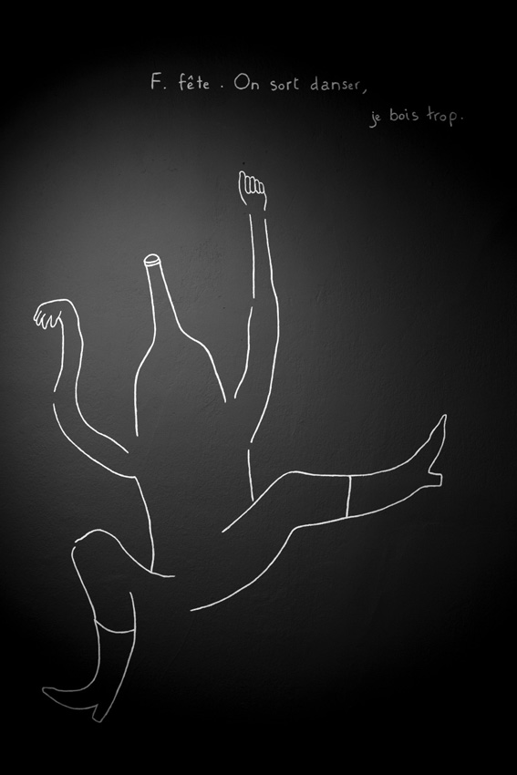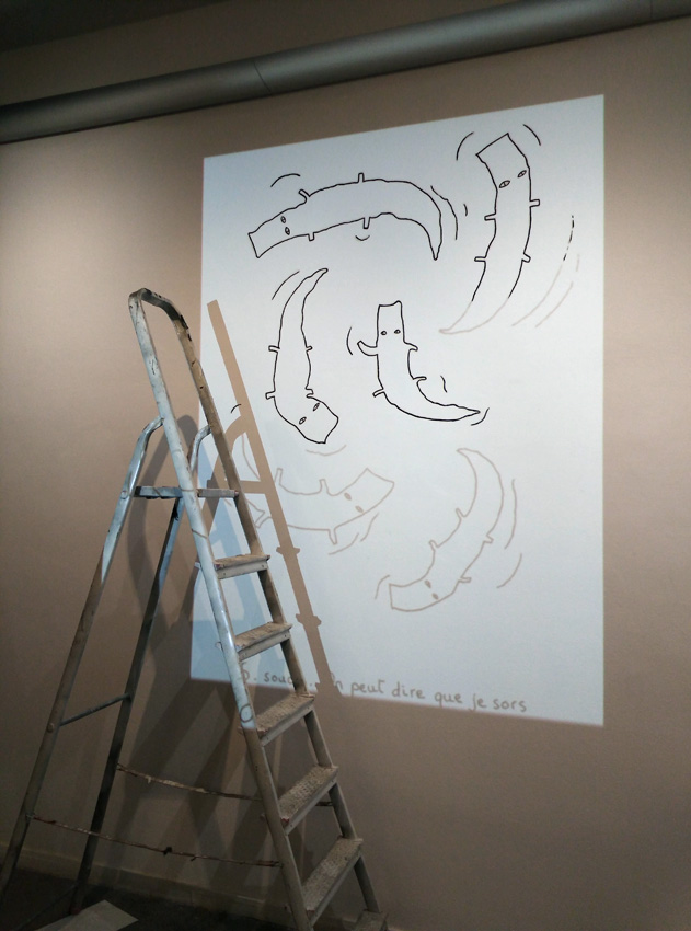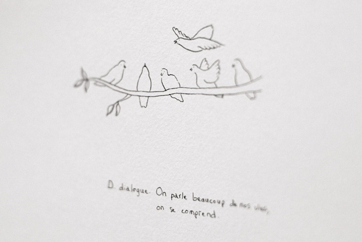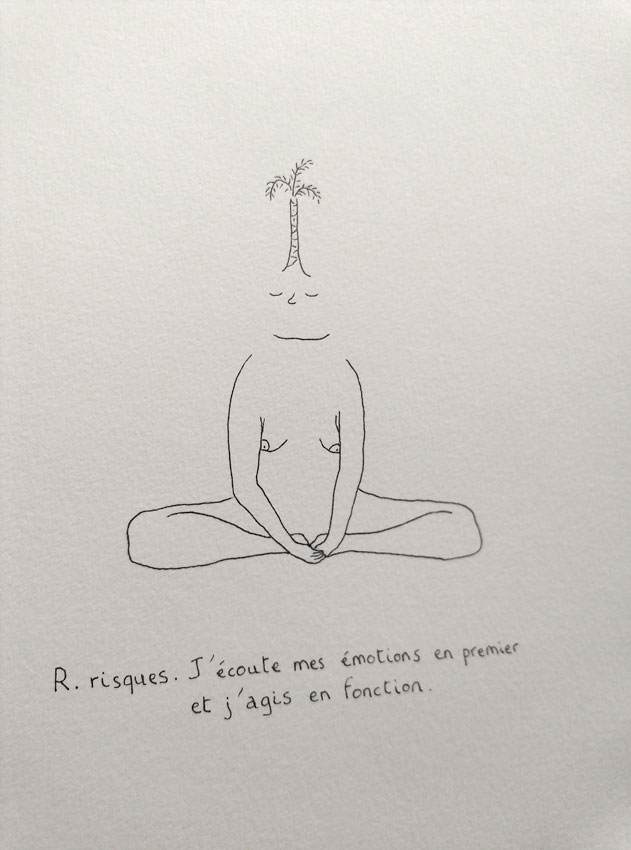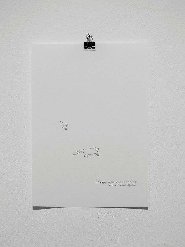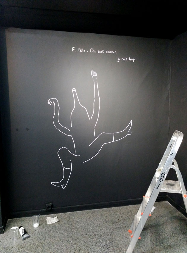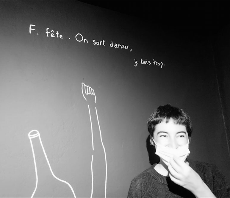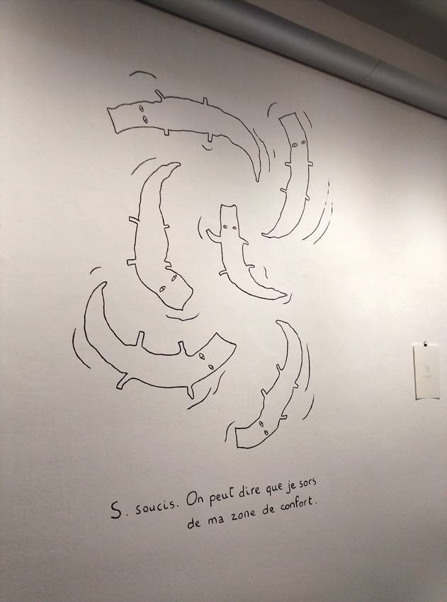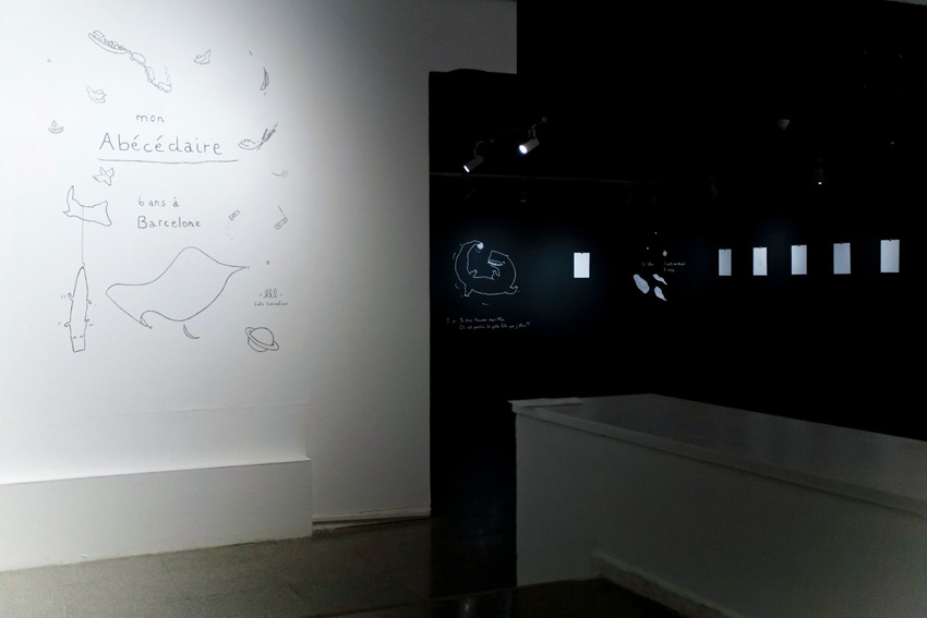 Invitée pour trois semaines de résidence avec pour thème imposé « les mots », j’ai choisi de créer un abécédaire très personnel. Mon abécédaire, 6 ans à Barcelone est une exposition de dessin qui relate mon expérience de vie à Barcelone, mes aventures, mes doutes, de manière poétique, transparente, honnête : une mise à nue. On avance dans cette exposition comme dans un parcours où l’ordre chronologique suit l’ordre alphabétique. Cette balade se rythme, s’articule autour de peintures murales, d’un mobile en papier et de dessins aux traits fins, presque fragils.