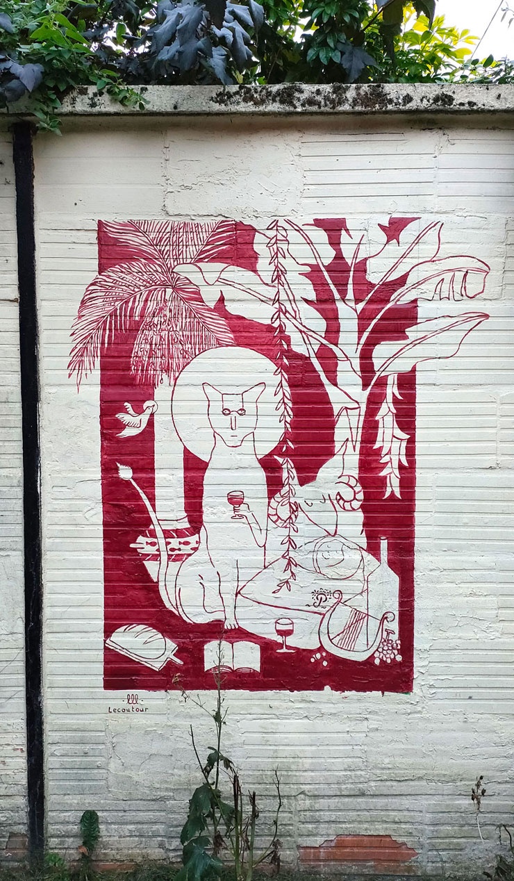 Une amie m’a commandé une fresque pour son jardin. Quelque chose d’un peu délirant en rapport avec la naissance de son enfant. Elle avait beaucoup aimé une fresque monochrome rouge que j’avais fait sur la terrasse d’un ami, style « affiche ».