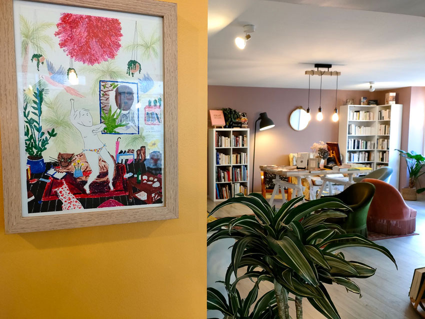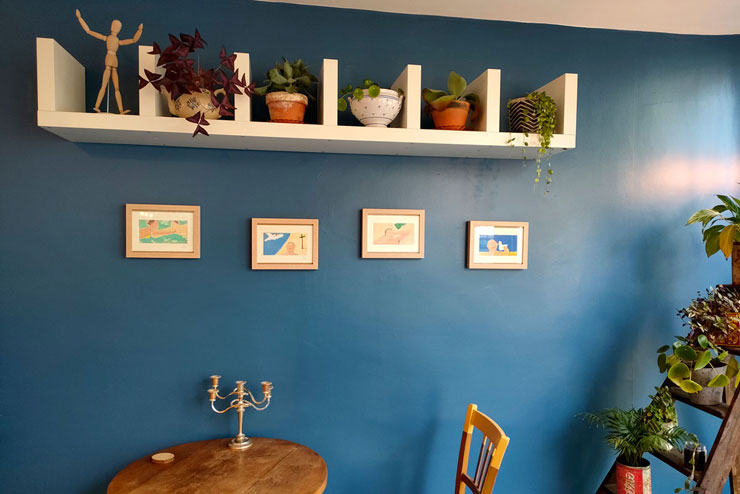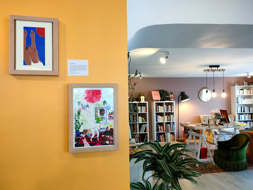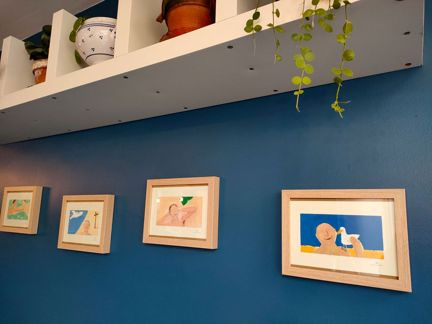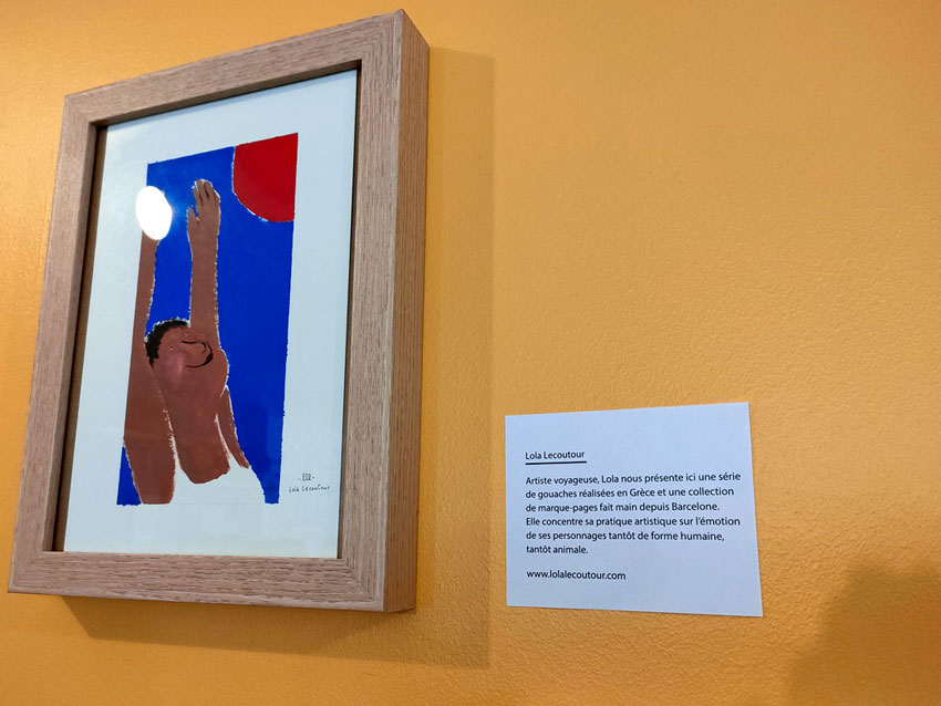 Prose café Exposition. Avranches 2022. Exposition dans un café littéraire en Normandie. Série de peinture à la gouache sur le thème de l’été. Voir les œuvres Marché.