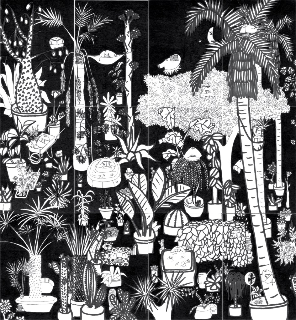 Puzzle de douze dessins indépendants qui s’assemblent pour former un grand format.