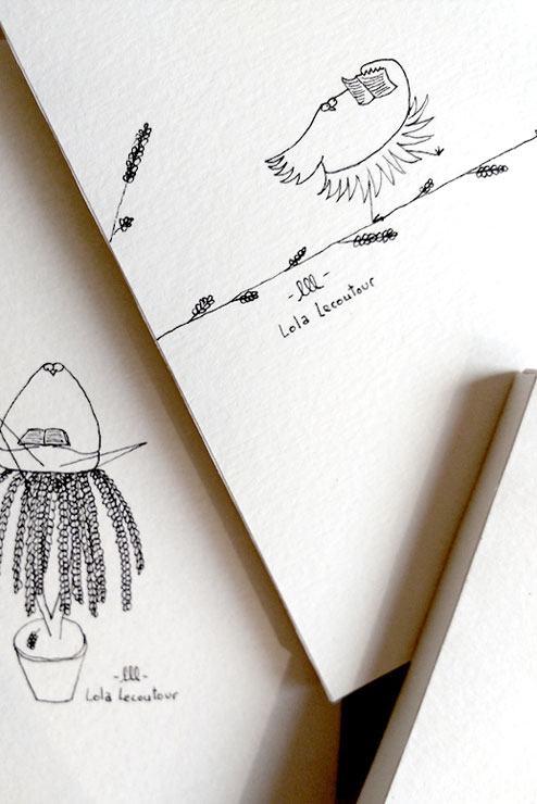 Fait à la main, j’ai joué avec des variations de noir et d’épaisseur de trait. Encre de chine (noir brillant), Promarker (noir-gris très mate), feutre simple noir (entre-deux) et stylo feutre ultra fin.